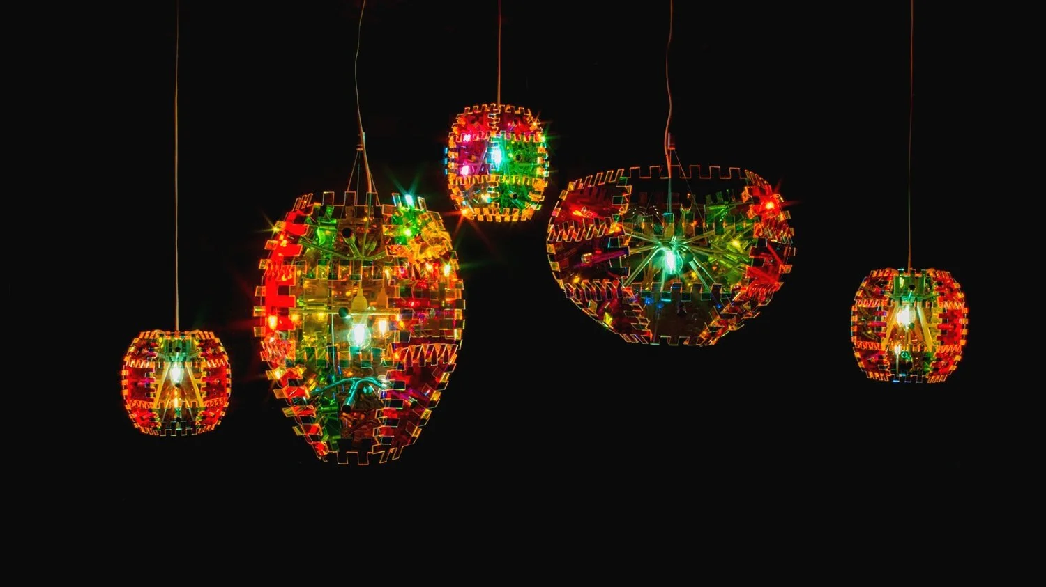 A little disco, a little sputnik, using refractive film the Crenellated Lamps employ interweaving panel edges to puzzle together. The tabs create layered color mixing as the panels meet at various angles, maximizing colors refraction. The lamps were designed in 3 sizes, the first two larger version as pendant lamps, with the third, smallest lamp having built in feet so that it could for surface or suspension.