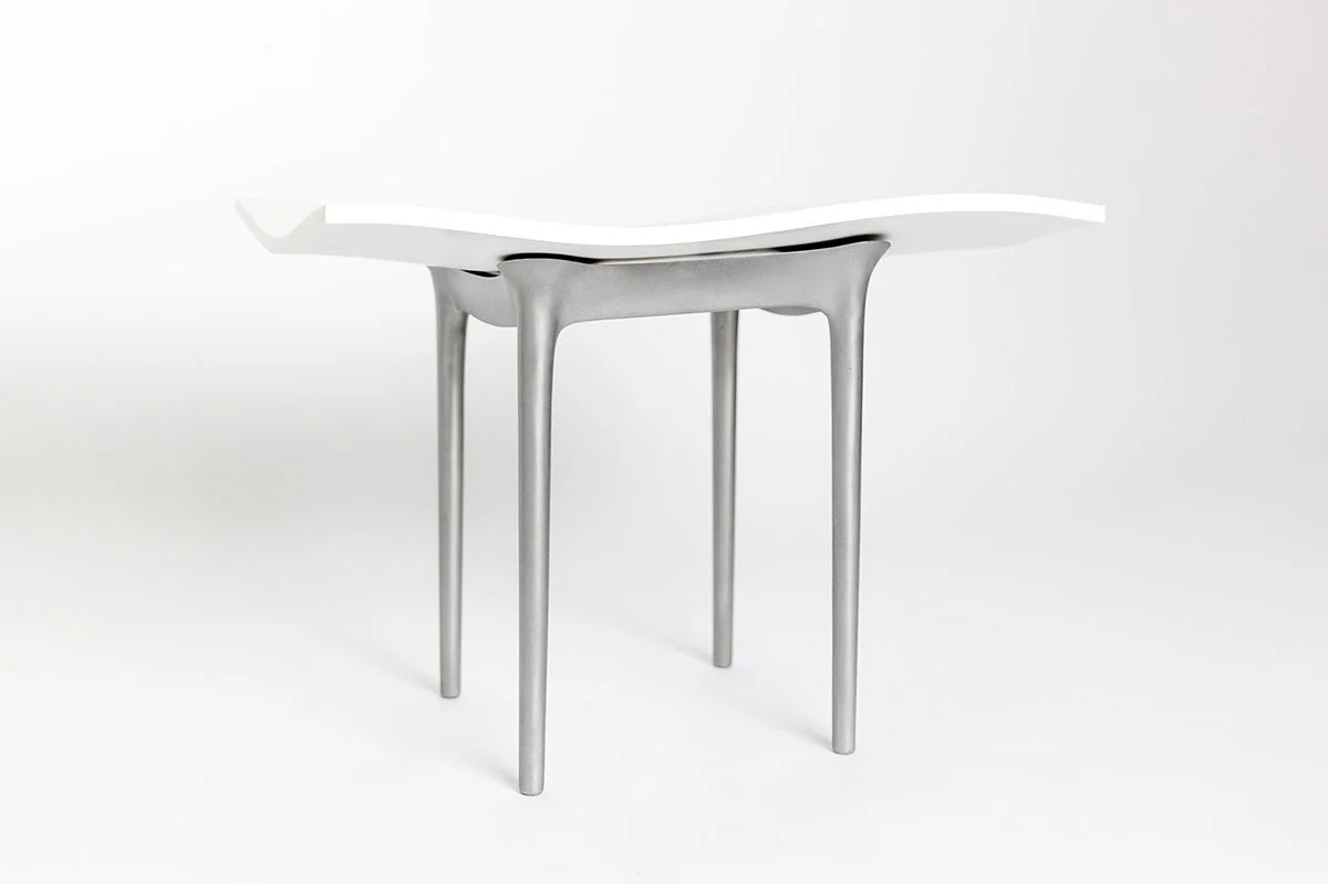 Subtle movement and softened curves allude to the murmur that gives this stool it’s name. The molded Corian seat lightly floats atop a minimal cast aluminum frame.
