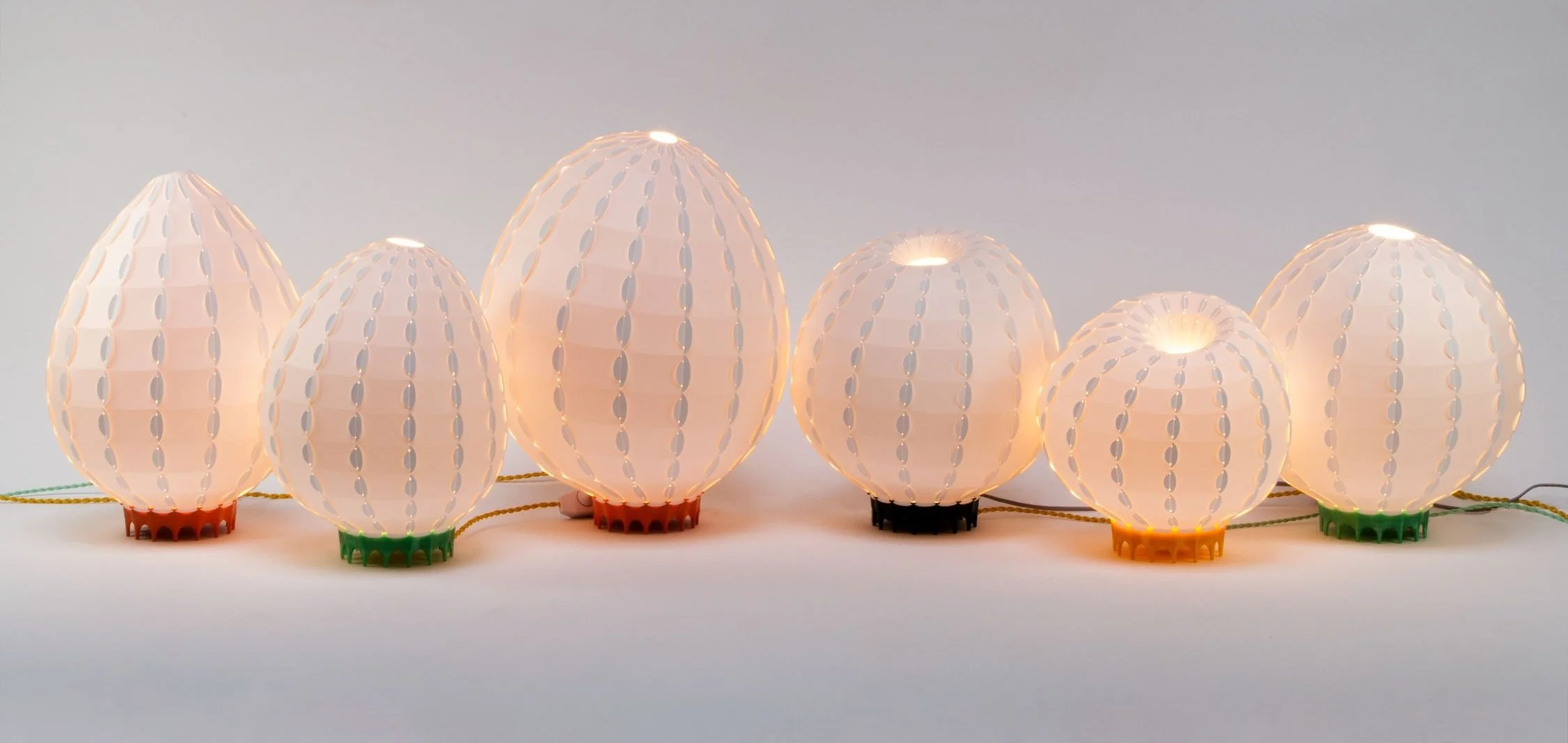 Signature tabbed inserts create a light-shadow interplay, becoming both structure and ornament. Flat-packed and assembled without hardware or glue, each lamp is generated from a custom parametric system, allowing for diverse forms through flexible connection geometry and a shared standard socket base. The result is a luminous, otherworldly object—part botanical, part digital—floating between nature, fantasy, and futuristic design.